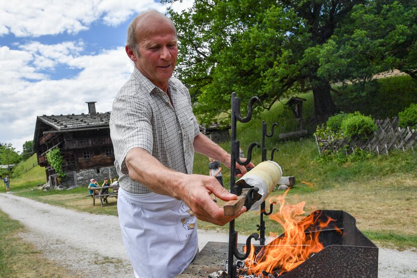 Gleichmäßig dreht sich die Holzwalze über dem knisternden Feuer. Die Konstruktion erinnert an ein Asterix-Comic, nur das saftige Spanferkel fehlt. Stattdessen träufelt Hermann Mader einen dickflüssigen Teig auf die Walze (Prügel) und dreht sie beständig. Schicht für Schicht entsteht so jener goldbraune Baumkuchen, der seine Herstellung bereits im Namen trägt: Die Prügeltorte. Hermann Mader hat die ursprüngliche Backtradition nach altem Vorbild übernommen und an seine Tochter Belinda Mader weitergegeben. Im Familienbetrieb in Kramsach dreht sich seit 1988 alles rund um die süße Torte. Das Rezept stammt ursprünglich aus Brandenberg. Seit Generationen wird die Prügeltorte als Festgebäck zu Familienfeiern, Hochzeiten oder Taufen gebacken. Selbst Königin Elisabeth II. bekam bei ihrem Besuch in Innsbruck ein solches Schmuckstück überreicht. Heute noch steht die Backware an hohen Feiertagen auf dem Tisch vieler Brandenberger.