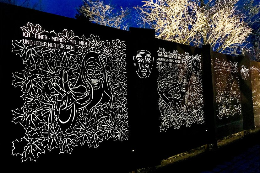 Wie in Dantes Göttlicher Komödie scheinen auch hier die Peiniger gepeinigt von den eigenen Taten. Dazu sagt der Bildhauer und Künstler Markus Thurner: "Wie man sieht, kommt der Tod zum Tanz. Und er beugt sich über einen Schlafenden. Heimtückisch taucht er auf. Und er greift nach dem ahnungslosen Menschen. Es ist ein MEMENTO Mori", also um ein "gedenke des Todes".