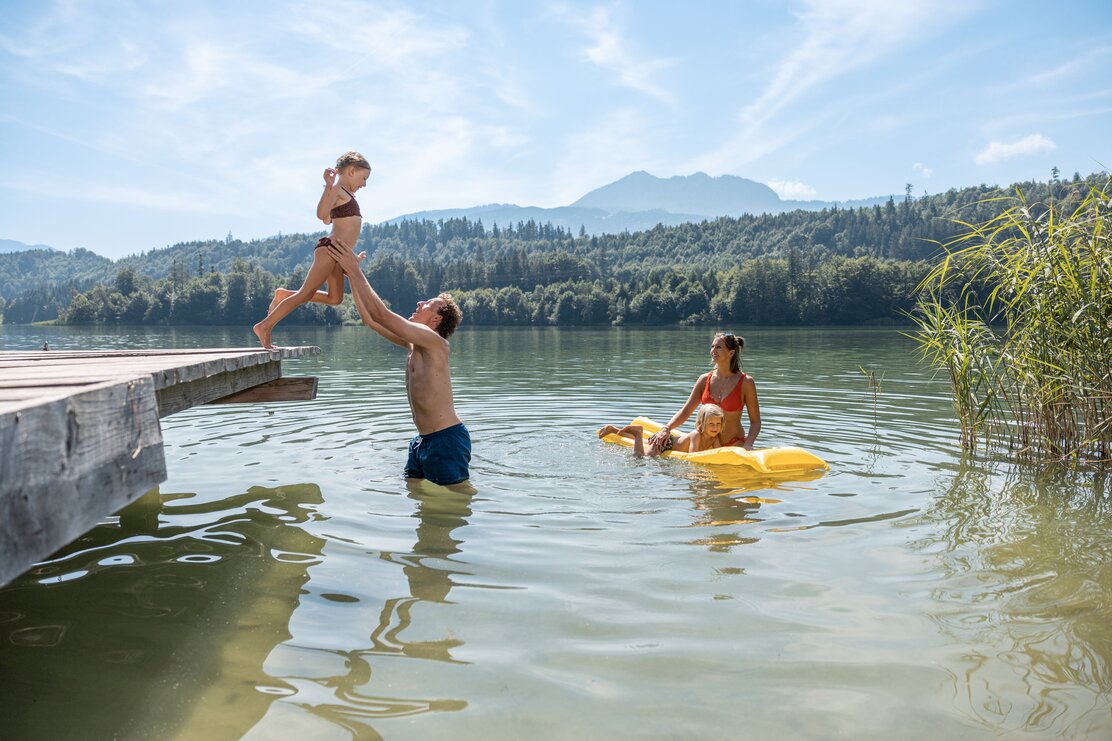 • Vater hebt seinen Sohn vom Steg in den Reintalersee, die Mutter wartet bereits im Wasser mit dem Sohn auf einer Luftmatratze  | © Alpbachtal Tourismus Vater hebt seinen Sohn vom Steg in den Reintalersee, die Mutter wartet bereits im Wasser mit dem Sohn auf einer Luftmatratze  | © Alpbachtal Tourismus