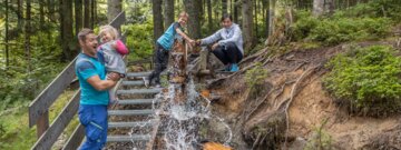 Eine Familie spielt gemeinsam an einem Wasserspiel im Juppi Zauberwald in Reith i.A.  | © Alpbacher Bergbahn | shootandstyle