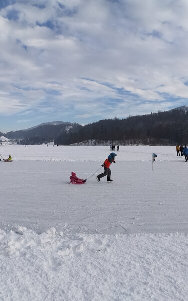 Lass dich vom Bewegungsdrang der Kinder anstecken: Drehungen ausprobieren, mit spritzendem Eis abbremsen, rückwärts laufen, 8-er fahren. Ein Wettlauf am Eis darf natürlich auch nicht fehlen!