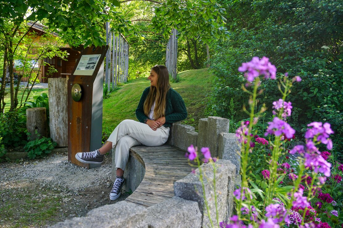 • Eine Frau sitzt entspannt auf einer Rastbank im Hildegard von Bingen Garten in Reith  und hört sich die Rastbank G'schichten an | © Alpbachtal Tourismus Eine Frau sitzt entspannt auf einer Rastbank im Hildegard von Bingen Garten in Reith  und hört sich die Rastbank G'schichten an | © Alpbachtal Tourismus