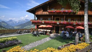 Das Haus bietet eine urige Stube und einen schönen Gastgarten mit einmaligem Ausblick auf die Berge und auf Alpbach, dem "Schönsten Dorf Österreichs".