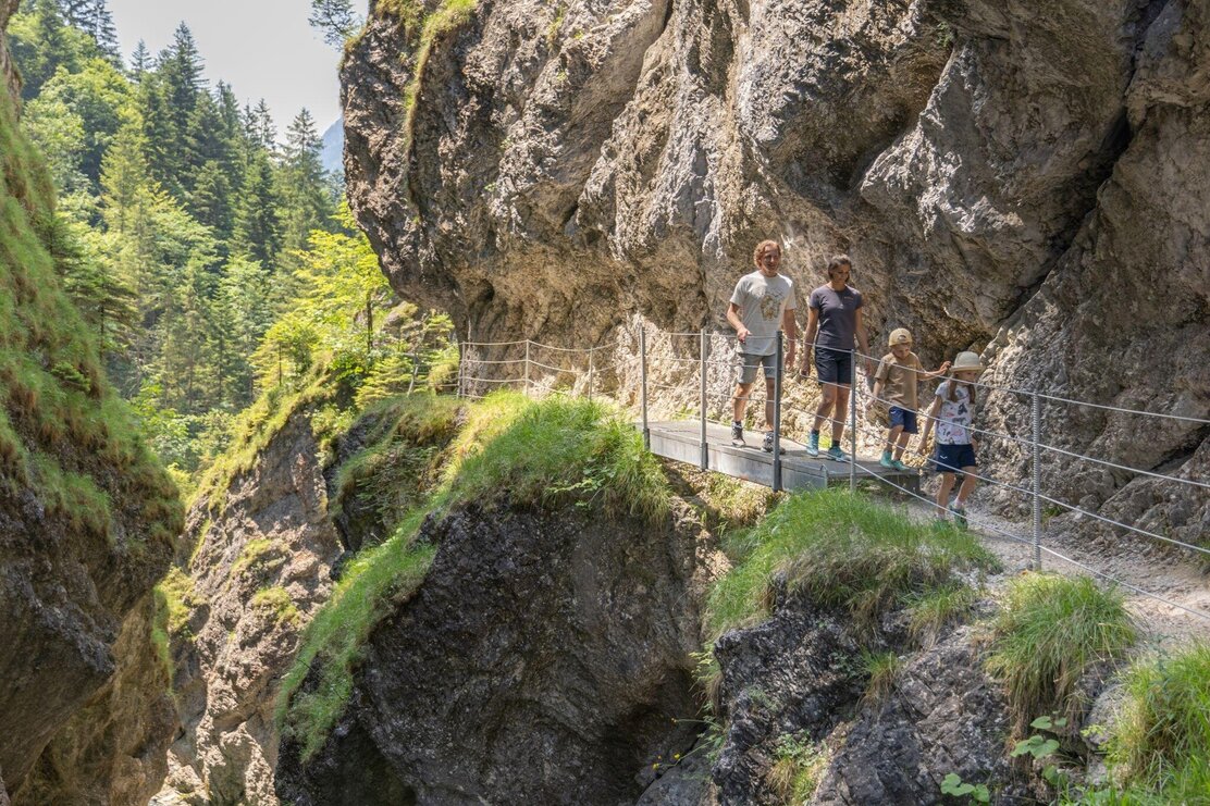 Ab dem Einstieg zur Tiefenbachklamm wandern wir über Waldboden ein Stück direkt an der Ache entlang, doch schon bald verengt sich das Tal. Der gut gesicherte, enge Steig führt die meiste Zeit über Stein- und Schotterboden hoch über der tosenden Brandenberger Ache. Besonders beeindruckend in dieser Klamm sind die bizarren Felsformen. Nach ca. 1,2 km gelangen Sie an eine Aussichtsplattform. Tief unter uns hat das Wasser nur noch sehr wenig Platz in der engen Schlucht. Der weitere Weg quert dreimal die Ache. Die Brücken eignen sich besonders, um Kanufahrer zu beobachten. Es öffnet sich plötzlich das Tal und man gelangt auf eine Wiese. Hier befindet sich die Einkehrmöglichkeit Jausenstation Tiefenbachklamm. Für diese Teilstrecke sind weitere 90 Minuten Gehzeit einzuplanen.