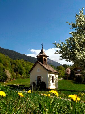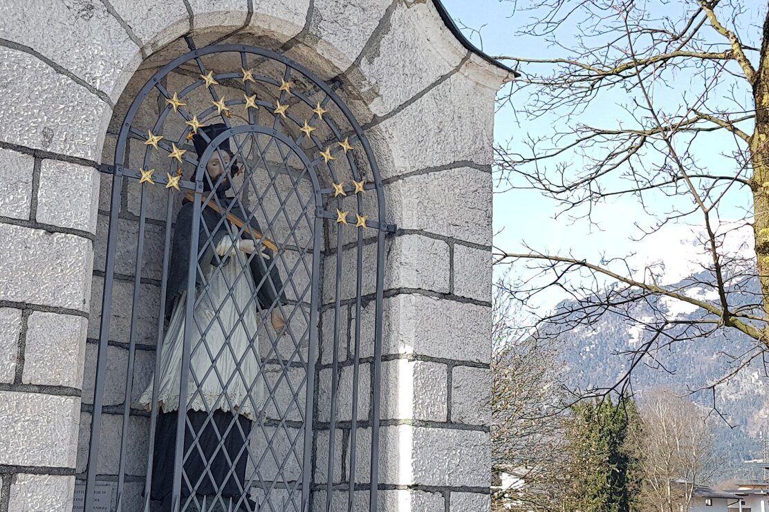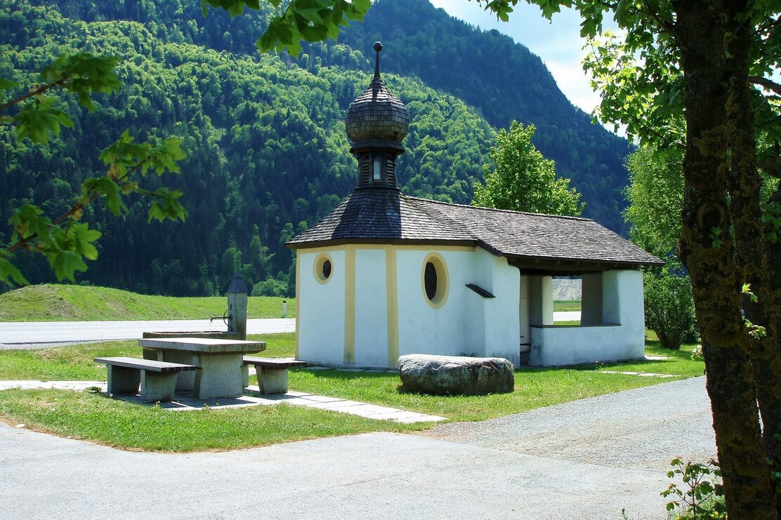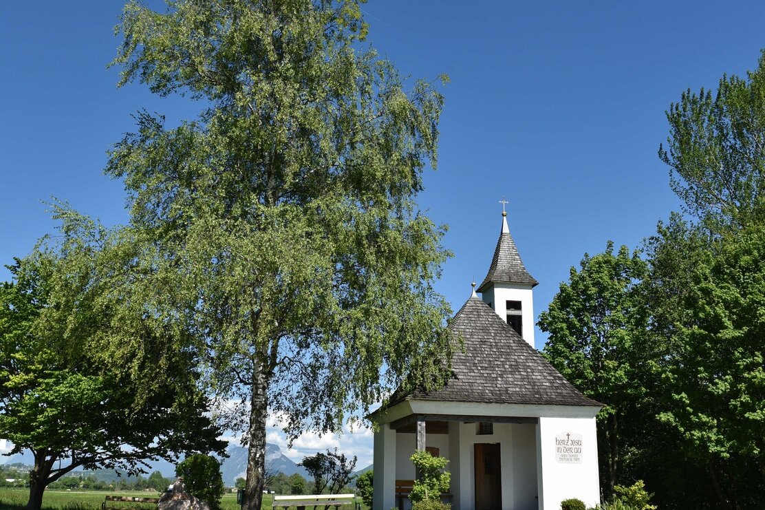 Ein kurzes Stück (ca. 200 m) müssen entlang der Bundesstraße ostwerts gehen, bevor die erste Abbiegung links wieder in Richtung Dorf (Unterdorf) führt. Hier unter der Bahnunterführung durch und gleich rechts abbiegen und dem Spazierweg entlang der Bahn ca. 200 m folgen und bei der ersten Abbiegemöglichkeit links gehen. Vorbei am kleinen Dorfbach immer geradeaus in Richtung Norden geht der Weg entlang des grün-bewachsenen Windgürtels bis zur Kapelle Herz Jesu in der Au. Hier kannst du beim am Trinkwasserbrunnen aus Marmor deinen Durst löschen und die im Jahr 2000 eingeweihte Kapelle, welche von den Radfelder Schützen erbaut wurde, nützen um deine Gedanken zu ordnen oder einfach zu rasten.