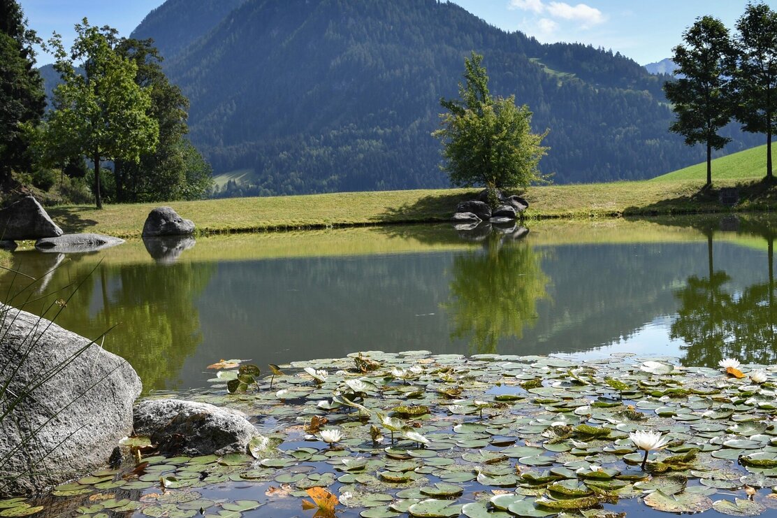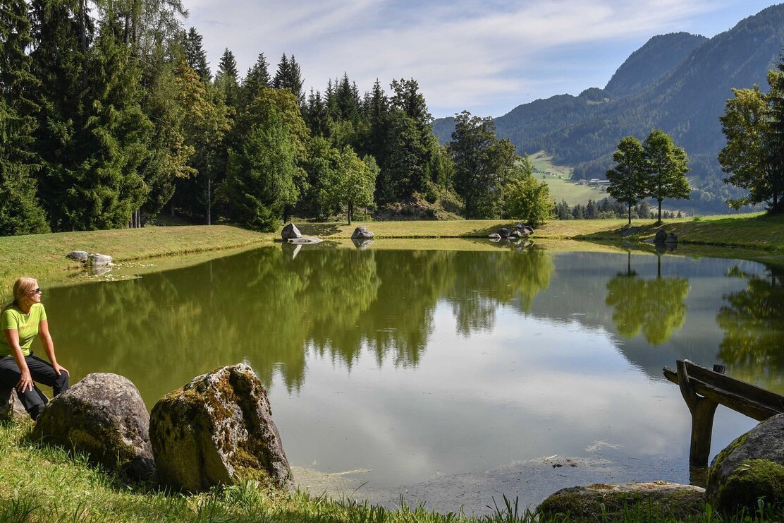Vom Almstüberl aus erreichst du den idyllischen Speicherteich, der zu einer kleinen Rast einlädt. Am Bauernhof Wölzenberg links vorbei, und entlang eines sehr steilen Forstweges ins Tal. Du erreichst nach ca. 10 min. den Angererhof, von dort Richtung Ortszentrum Reith i .A./Talstation Reitherkogelbahn (Ausgangspunkt) gehen.