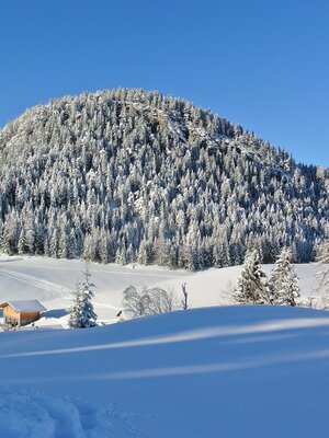 Oben angekommen, trittst du hinaus in eine märchenhafte Winterwelt. Der gut präparierte Weg führt dich durch einen verzauberten Wald, in dem die Bäume wie mit Zuckerguss überzogen sind und die Schneekristalle in der Sonne glitzern. Genieße die klare, frische Alpenluft und die Ruhe am Berg.