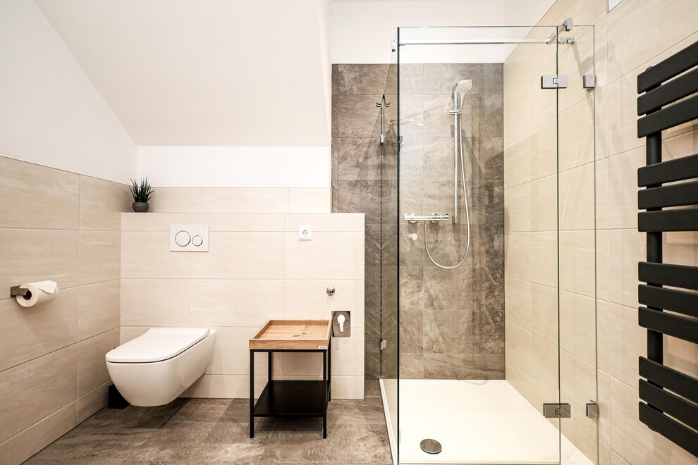 Das Badezimmer ist modern und funktional gestaltet und verfügt über eine Dusche und ein WC.