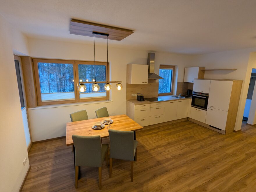 Es verfügt über ein Schlafzimmer mit Doppelbett und einem Bad mit Dusche und WC. Die Wohnküche, in der sie ihr Lieblingsessen zaubern können, ist mit Geschirrspüle, Backofen, Mikrowelle, Kühl- und Gefrierschrank ausgestattet. Der TV lädt ein für entspannte Abende auf dem Sofa. Die Wohnung eignet sich perfekt für Paare, die Erholung in einer naturnahen Umgebung suchen.