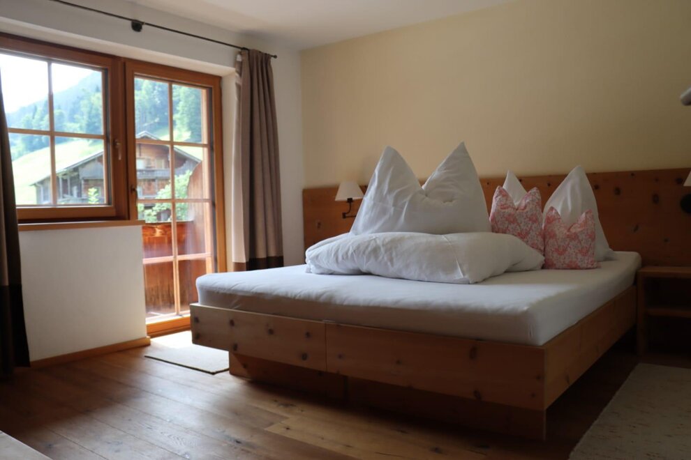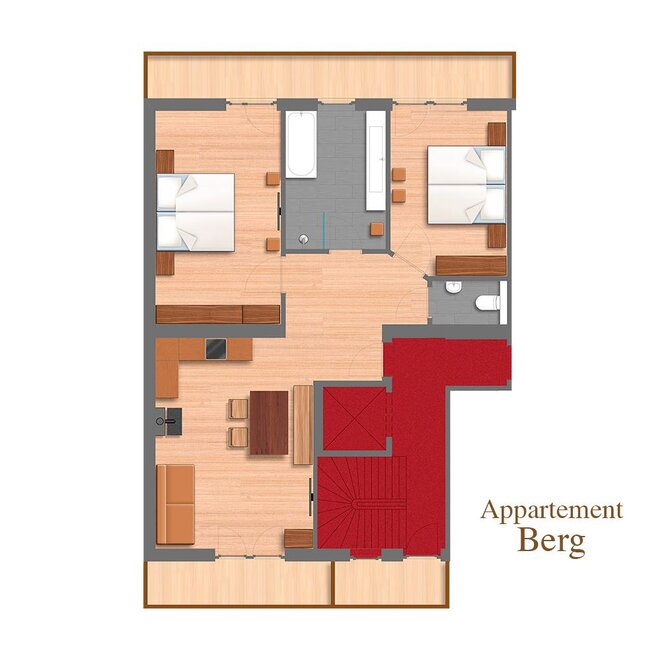 Unser kleinstes Appartement Zirbe im 1.Stock mit 2 Schlafzimmern, wobei in einem die Betten getrennt sind.