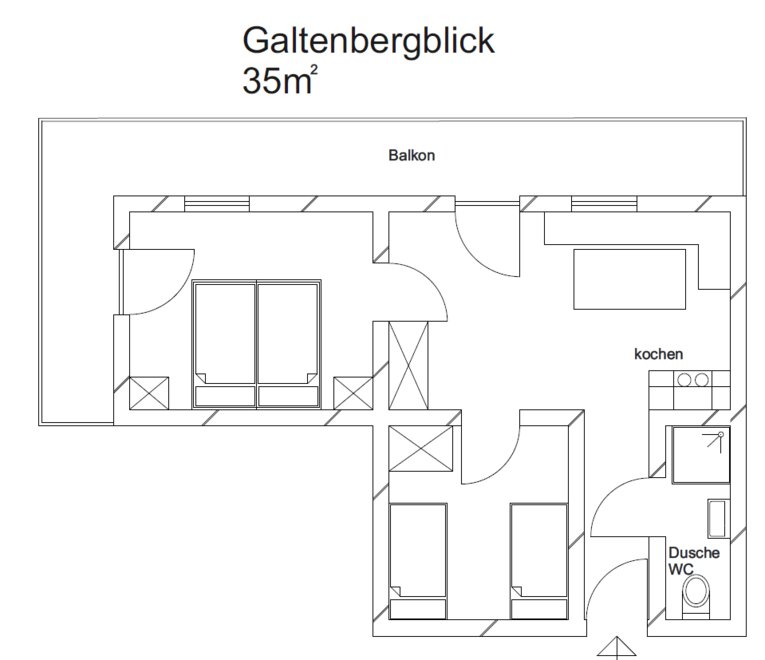 Die Wohnung besteht aus zwei separaten Schlafzimmern, welche durch einen Raum mit gemütlicher Sitzecke und Küche getrennt ist. Außerdem ist jedes Appartement mit Dusche und WC ausgestattet.