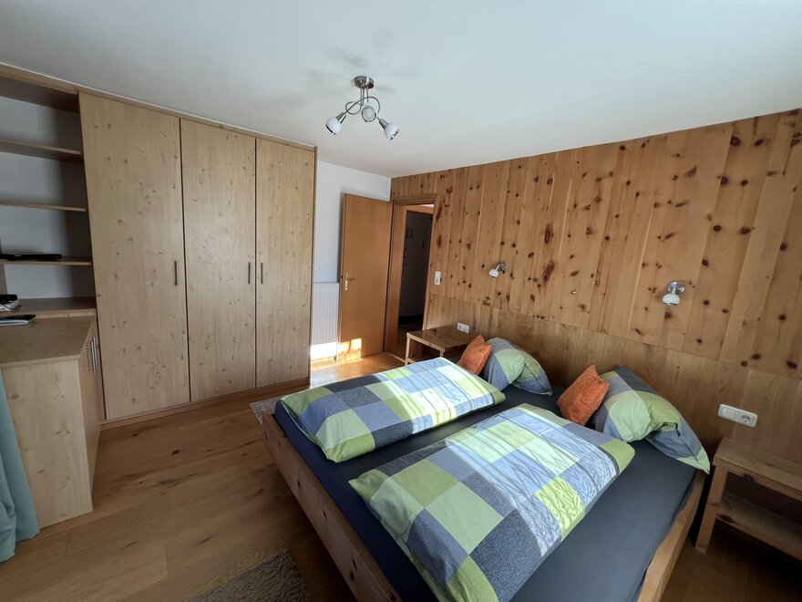 Die zwei Schlafzimmer in der Ferienwohnung, sind mit Naturholzböden und Betten und Möbel aus Zirbenholz ausgestattet.
