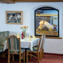 Gastlichkeit hat bei uns Tradition, dazu gehören für uns auch gute Stimmung und Geselligkeit. Wir möchten, dass Sie sich in Ihrem Urlaub von uns verwöhnen lassen und dass für Sie in dezentem Luxus sowohl internationales Flair als auch familiäre Atmosphäre fühlbar und erlebbar sind. Zur 'urigen' Stimmung trägt natürlich im Restaurant der Blick durch die Fenster in den Pferdestall bei. Je nach Jahreszeit können Sie vielleicht eine Stute mit ihrem kleinen Fohlen sehen.