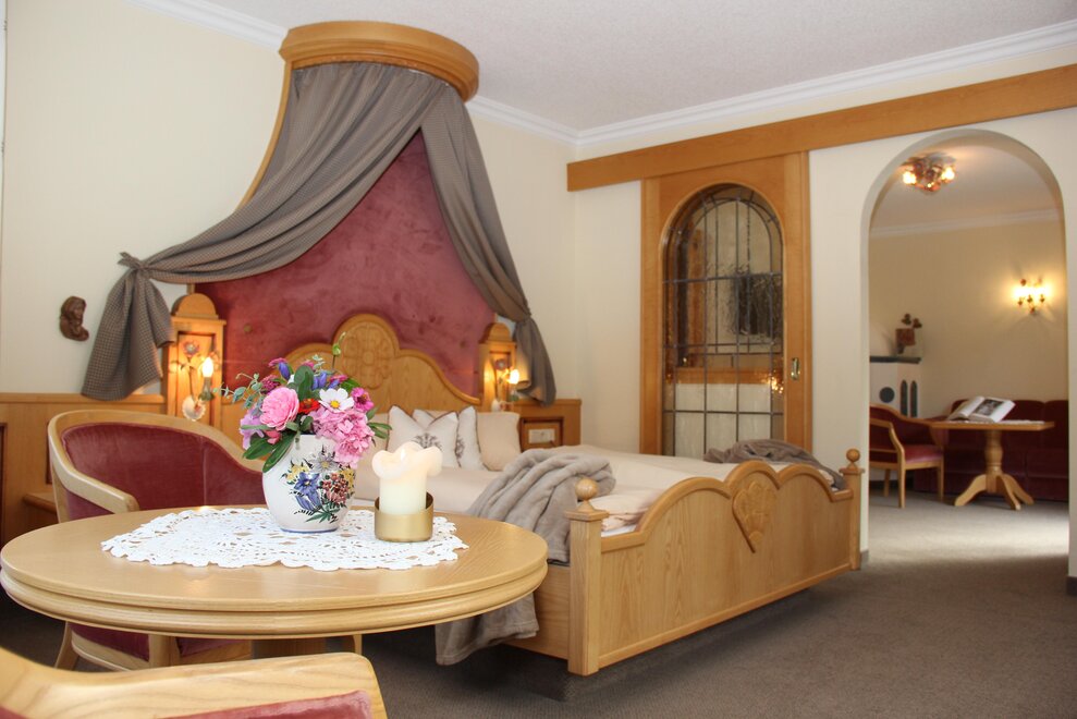 Unsere Juniorsuite "Edelweiß" ist ca. 45 m² groß, mit Bad, seperatem WC, Wohnzimmer mit Kachelofen, Wohnecke, 2 x 42" Flat-TV, Radio, Safe, Telefon, Schreibtisch, Bademäntel, Fön, Kosmetikspiegel ausgestattet und verfügt über eine Sonnenterrasse und einen Balkon.