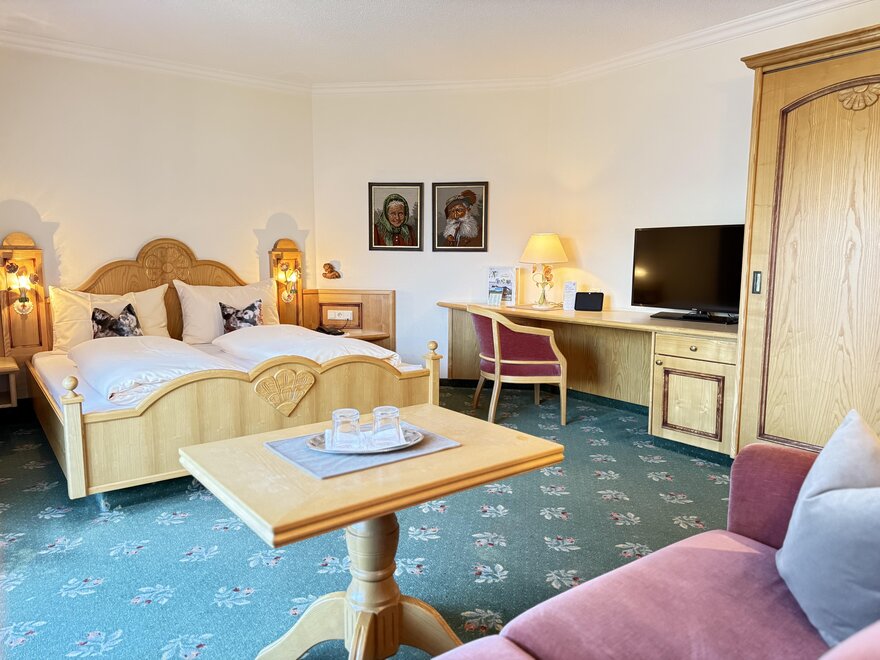 Das Zirbenholzzimmer ist ca. 22 m² groß, mit Dusche, WC, Fön, Kosmetikspiegel, Komfortbetthöhe, Schreibtisch, Safe, Flat-TV, Radio, Telefon und Balkon).