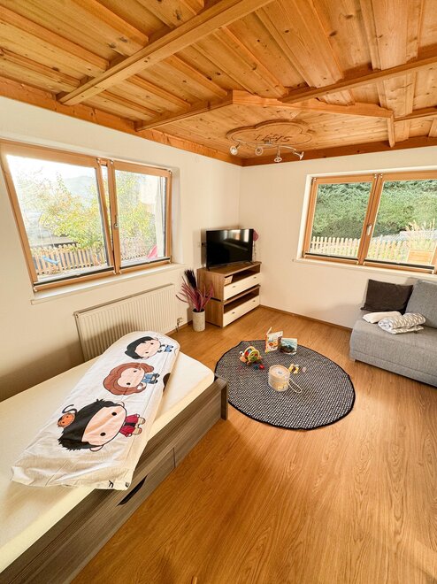 In der Küche befindet sich ein Esstisch mit Stühlen, wo alle Platz finden und in der voll ausgestatteten Küche das Essen zubereiten können. Gerne können Sie Ihr Essen oder Ihren Kaffee aber auch auf der Terrasse genießen- mit Blick auf die umliegenden Berge, die gemütlichen Terrassenmöbel laden dazu zum Verweilen ein. Ein zusätzliches Extra: Damit auch die Eltern mal in Ruhe fernsehen können, befindet sich im Schlafzimmer ein eigener Fernseher.