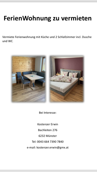Eine wunderschöne gemütliche Ferienwohnung in Münster in Tirol. Für Ausflüge sehr zentral gelegen. Der Mittelpunkt für Innsbruck, Kufstein, Zillertal, Alpbachtal,Achental, Brandenbergtal, Wildschönau.