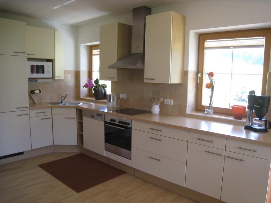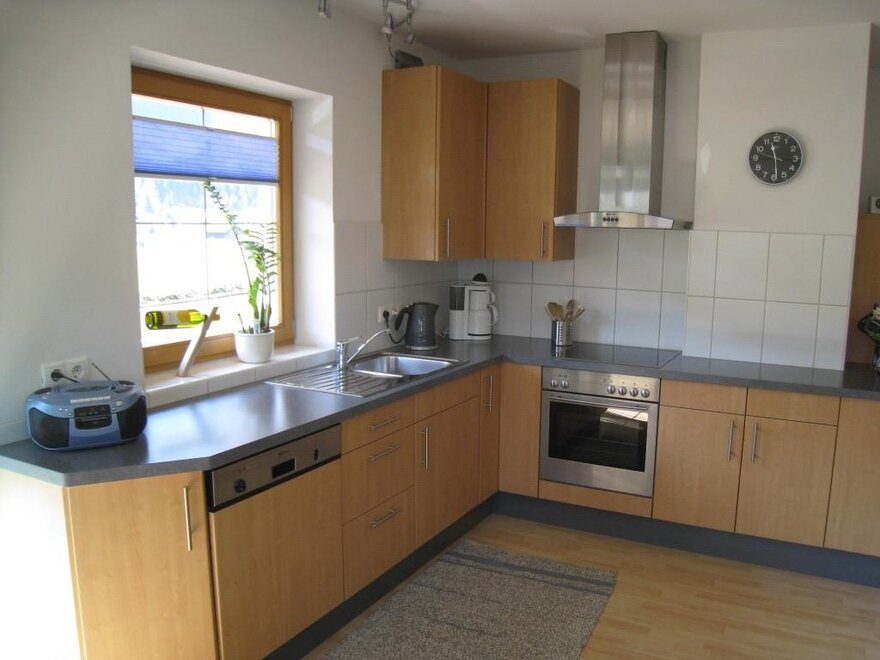 Großes Wohn/Schlafzimmer mit Sitzgarnitur (Schlafmöglichkeit für 2 Personen), SAT-TV, Radio, W-LAN, Essecke, eingebaute, offene Küche mit E-Herd- Ceranfeld, Backrohr, Spülmaschine, Mikrowelle, Kühlschrank mit Gefrierfach, Kaffeemaschine, Wasserkocher und Ausgang zum Balkon mit Gartenmöbeln und Blick auf´s Grüne und die Berge. Schlafzimmer mit großen Kleiderschrank und ebenso Ausgang zum Balkon.