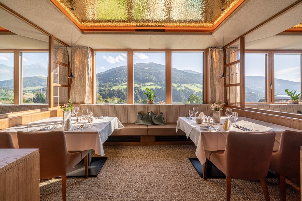 Mit Blick ins das Schönste Dorf Österreichs oder einem fantastischen Blick in den Garten und zum Bergpanorama – durch die großzügigen Glasflächen besonders eindrucksvoll. Ein gemütliches Sofa oder Sitzecke laden zum Flanieren ein, der heimische Zirben-Echtholzboden lädt zum Barfusslaufen ein. Eines der Zirbenzimmer verfügt über ein extra Einzelzimmer (Matratzengröße 0,90 x 2,00 m).