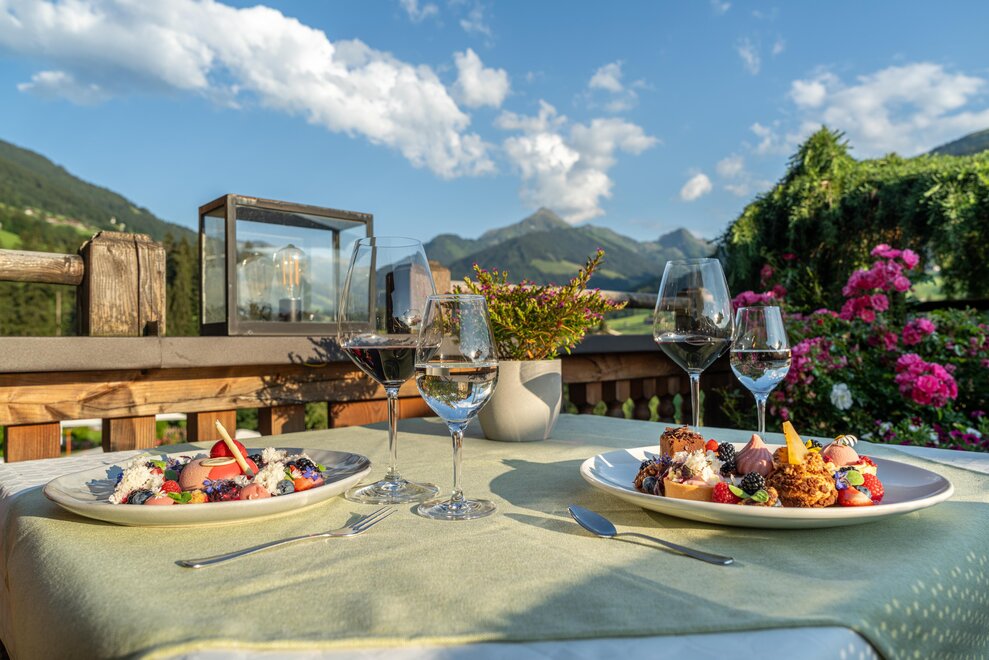Kulinarium auf höchstem Niveau: Frühstücksbuffet, Mittagsjause mit Salaten, Suppe und einem warmen Gericht, am Nachmittag Softdrinks zur freien Entnahme, Nachmittagsjause und Kuchenbuffet, am Abend Gourmet-6-Gang-Abendmenü mit 3 Hauptgerichten und einem vegetarischen Menü zur Auswahl - Hunde auf Anfrage