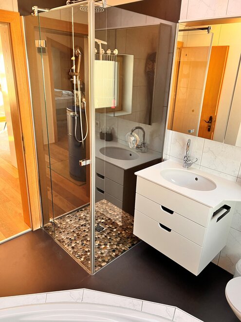 Das Badzimmer ist mit Dusche, Eckbadewanne und WC ausgestattet. Es gibt eine verschliessbare Garage für einen PKW und Parkmöglichkeit für einen PKW. Eine 400V Lademöglichkeit für Elektrofahrzeuge ist auch vorhanden mit Aufpreis.