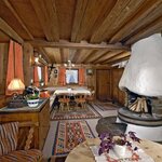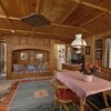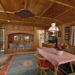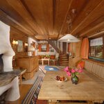 Im Erdgeschoss befindet sich ein Wohnraum mit Essplatz, außerdem eine gemütliche Couchecke mit rundem Tisch und offenem Kamin. Der große Raum ist mit antikem Holz vertäfelt und mit schönen alten Bauernmöbeln eingerichtet. Eigenes WC.