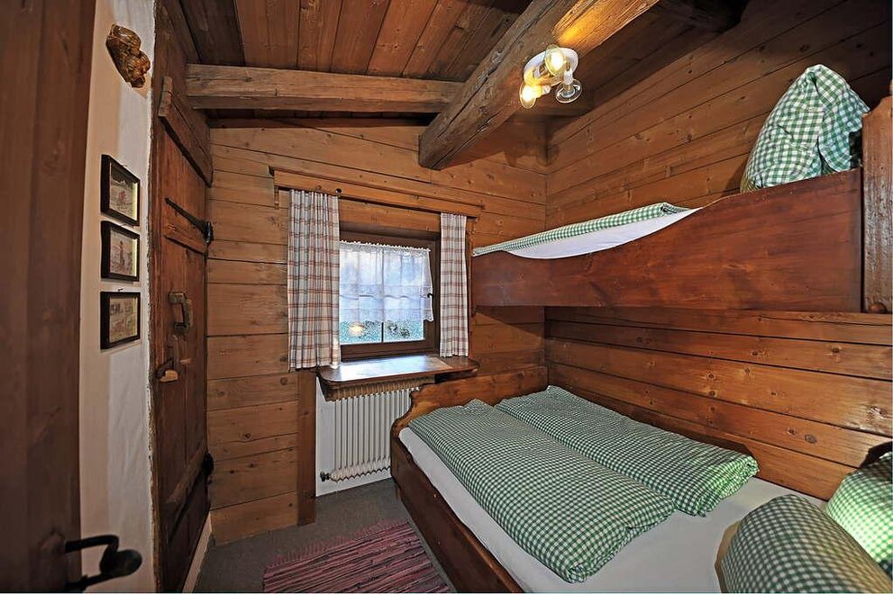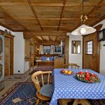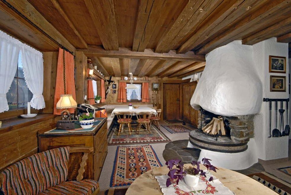 Im ersten Stock befindet sich ein großer Wohnraum mit Essecke für acht Personen und einer großen Couch. Der Raum ist mit altem Holz vertäfelt und mit schönen originalen Bauernmöbeln ausgestattet. Ein offener Kamin bildet den Mittelpunkt des Raumes, vollausgestattete Küche, Bad mit Dusche und WC. Vom Wohnraum führt eine Treppe in das ausgebaute Dachgeschoß mit 3 Doppelschlafzimmern und einem extra WC. Beide Stockwerke verfügen über Balkone mit herrlicher Aussicht. Vor dem Haus befindet sich eine große Liegewiese.