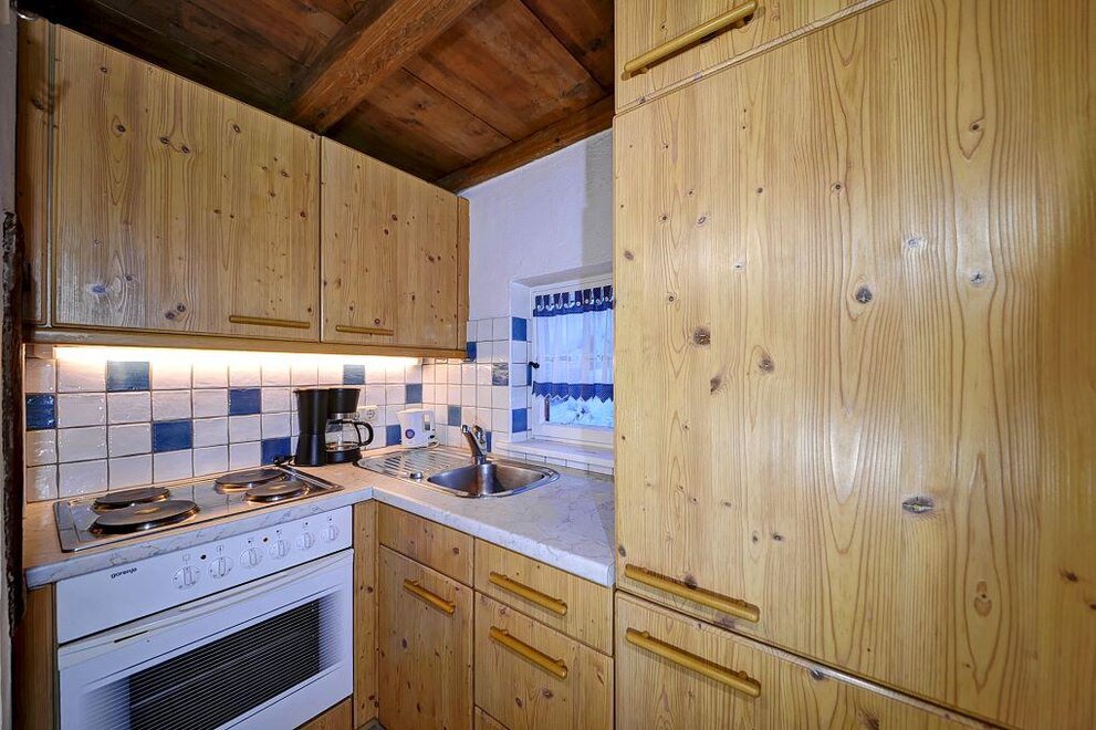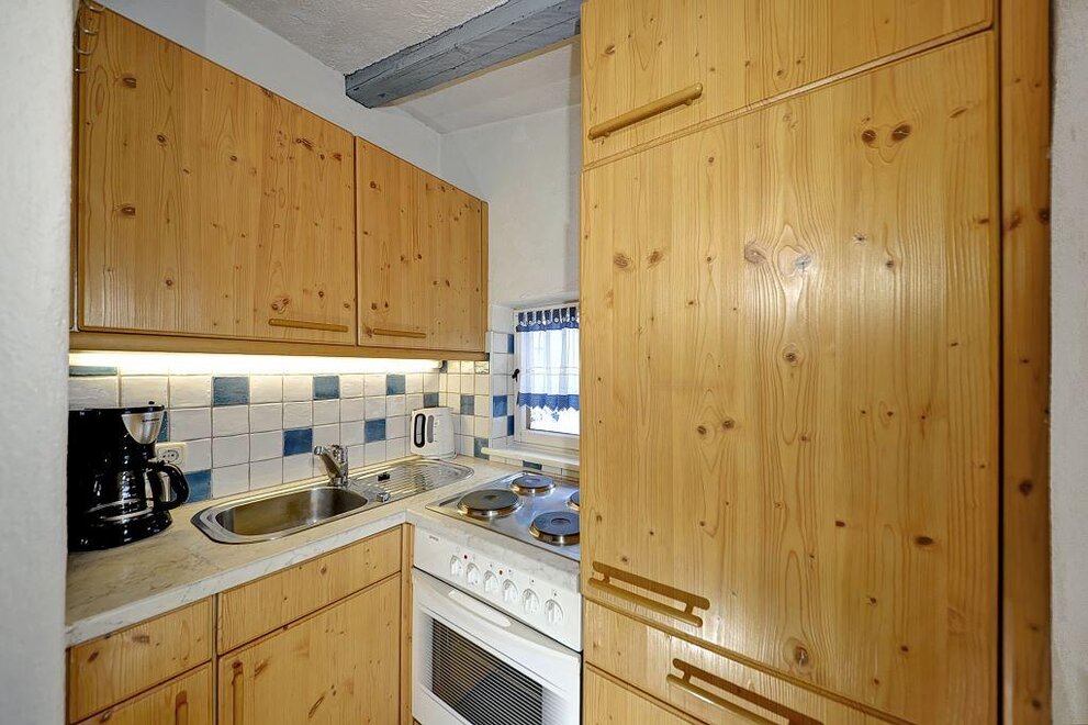 Die Wohnung umfasst einen Wohnraum mit Eckbank und Bauerntisch für 2 Personen, einen Schlafraum für 2 Personen (Einzelbetten), eine kleine Küche mit E-Herd und Kühlschrank (keine Spülmaschine), ein Bad mit Dusche, Waschbecken und WC.