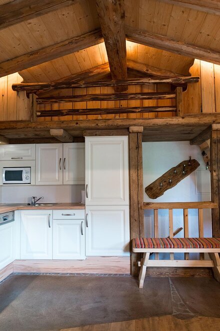 Das Holz von einer ca. 300 Jahr alten Hütte wurde zu einer gemütlichen Almwohnung umgewandelt.