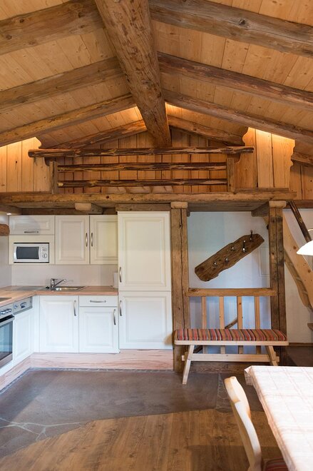 Das Holz von einer ca. 300 Jahr alten Hütte wurde zu einer gemütlichen Almwohnung umgewandelt.