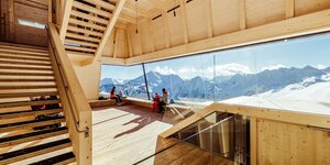 In keeping with the tradition of the Alpbachtal region, the tower was built from wood and clad with around 25,000 handmade shingles. The large panoramic windows also provide light and a far-reaching view of the surrounding mountains - a Tyrolean parlour, architecturally reinterpreted by the Innsbruck-based architecture studio Snøhetta.