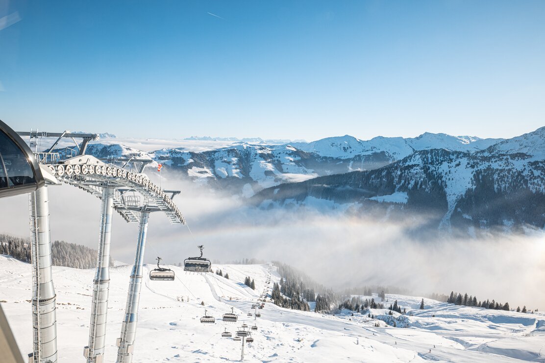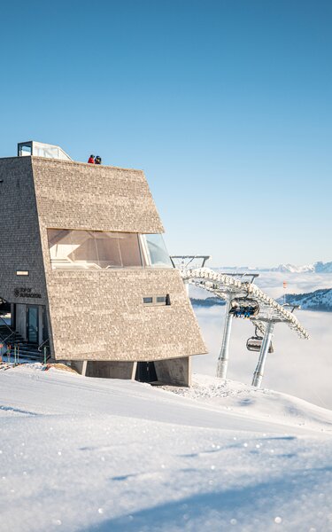 From the top station of the Pöglbahn gondola, you can ski directly to the bottom station of the Hornbahn 2000 and enjoy a comfortable ride to the viewing tower.