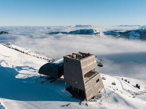 The 13 metre high viewing point also offers an indoor area with a seating corner and large glass fronts that allow you to immerse yourself into the snow-covered Alpbach mountains.