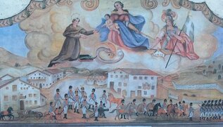 The fresco was painted in 1822 and depicts a scene from the "Tyrolean Rebellion" in 1809 at the Bergisel in Innsbruck. The picture shows the withdrawal of the French-Bavarian troops who had lost the battle against the Tyroleans.
