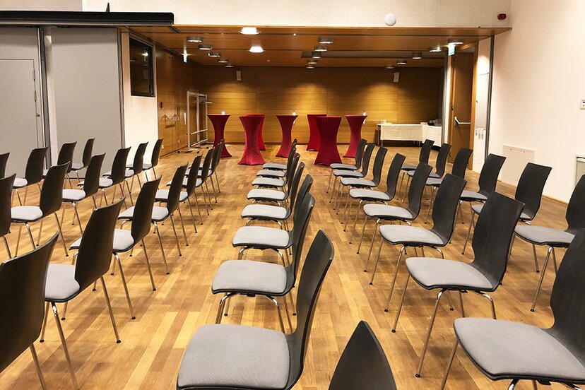 Equipment: flipchart, pin board, internet connection, beamer, screen, DVD player, microphone intercom system.
