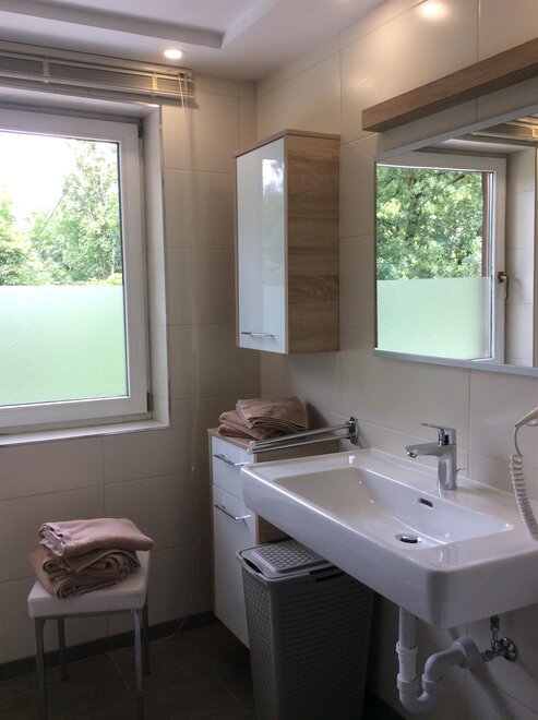 The spacious bathroom offers ample space for all guests and the WC is separate.