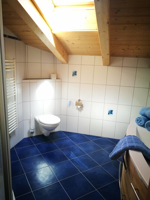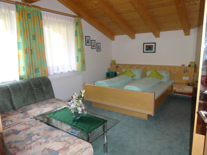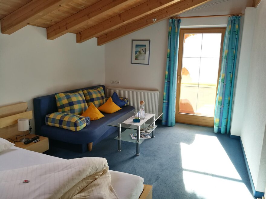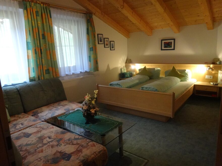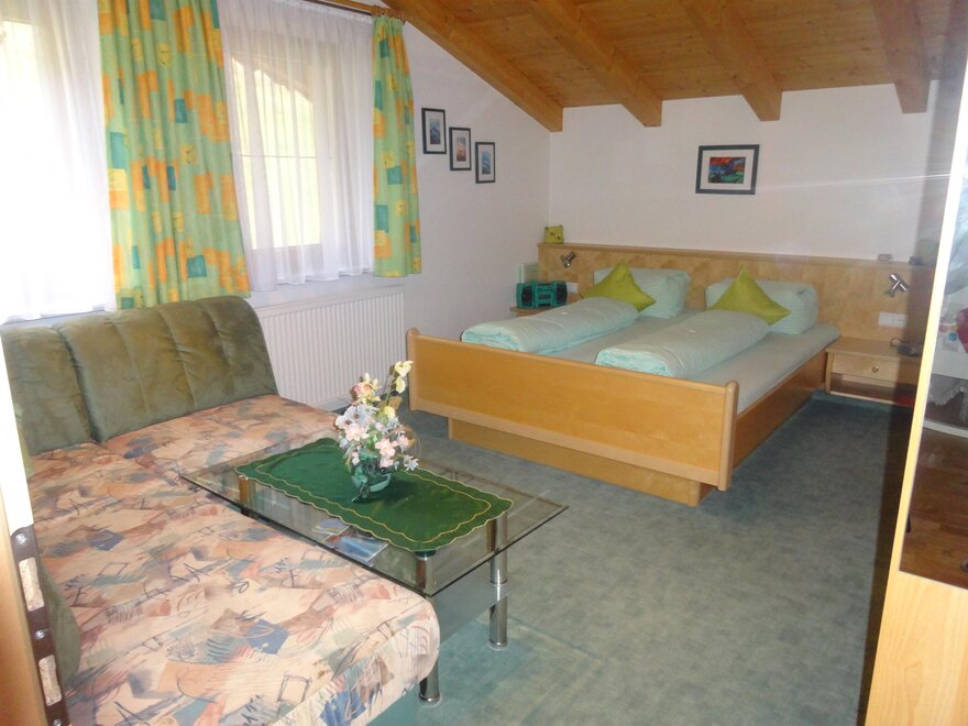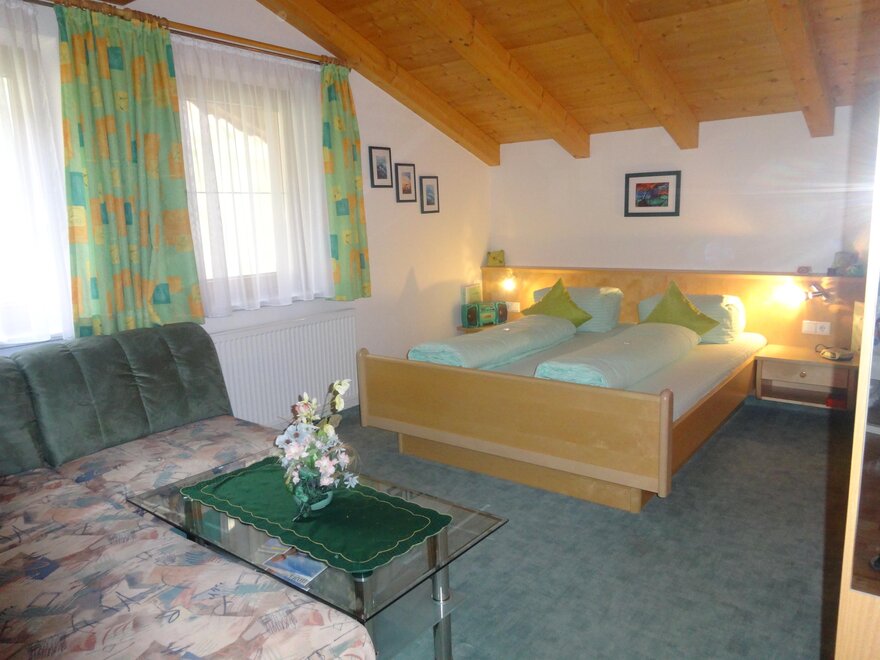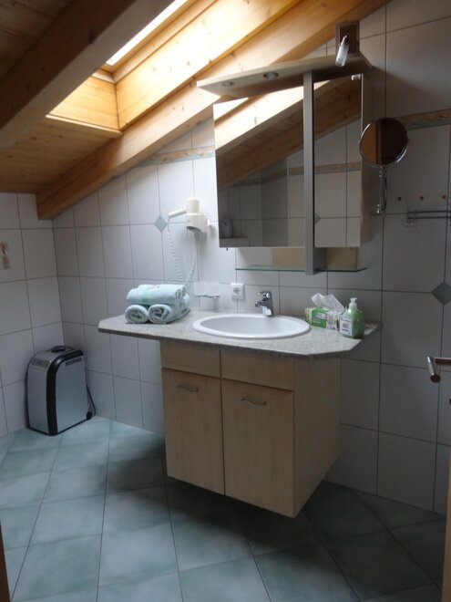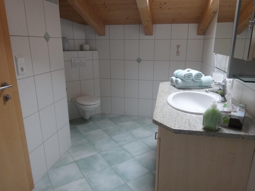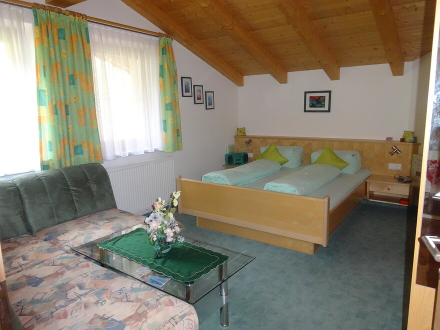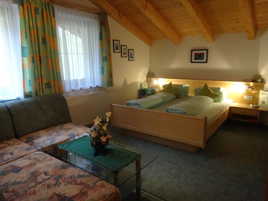 This dreamlike room (approx. 30 m²) with a comfortable couch corner and satellite TV is located on the ground floor, with its own bathroom (approx. 5 m²) with shower, WC and washbasin and a homely, cuddly roof frame and balcony, which is south facing and in a totally quiet location!