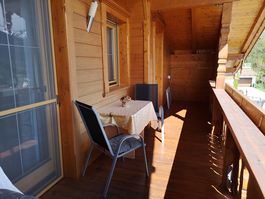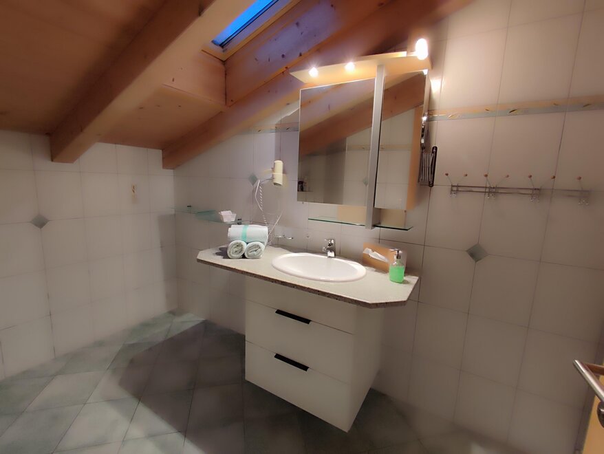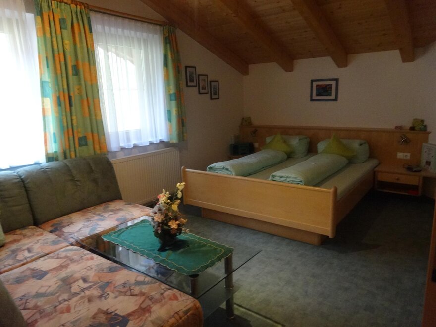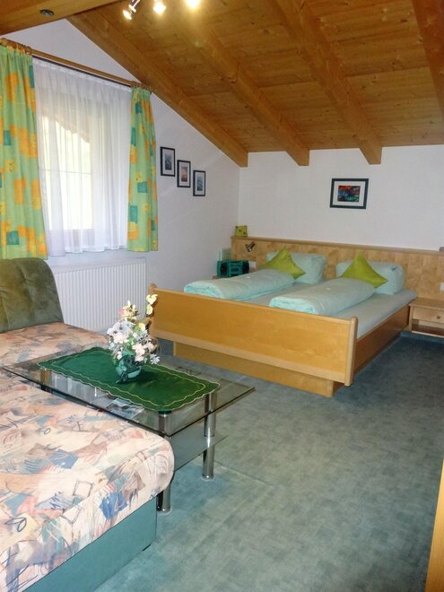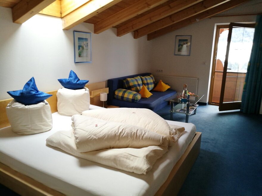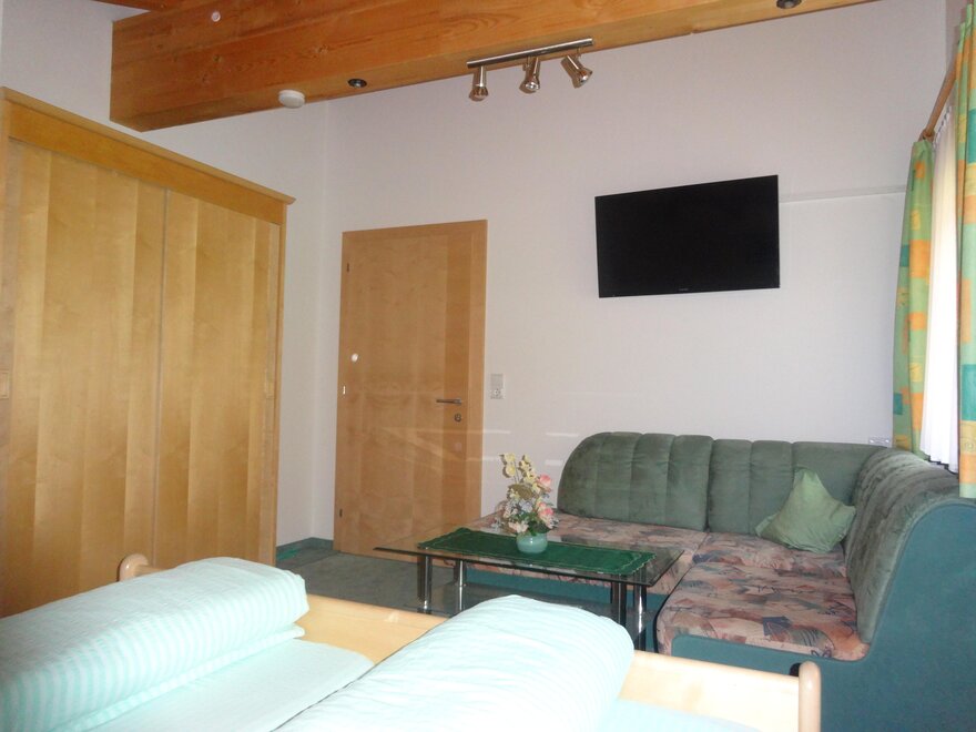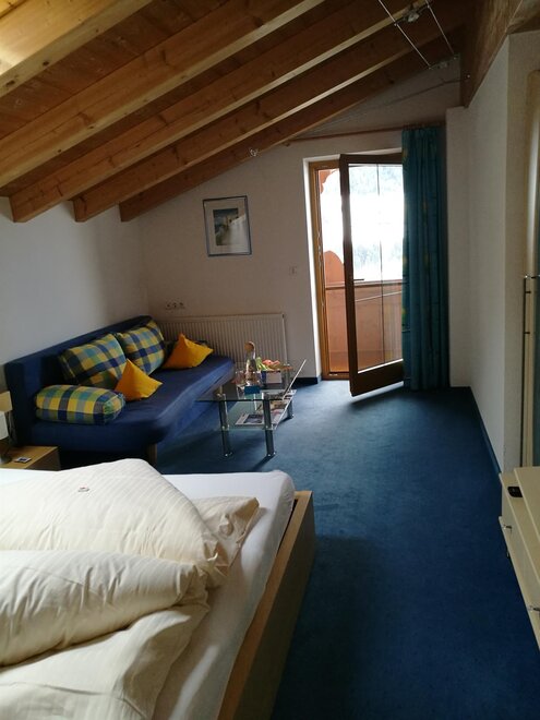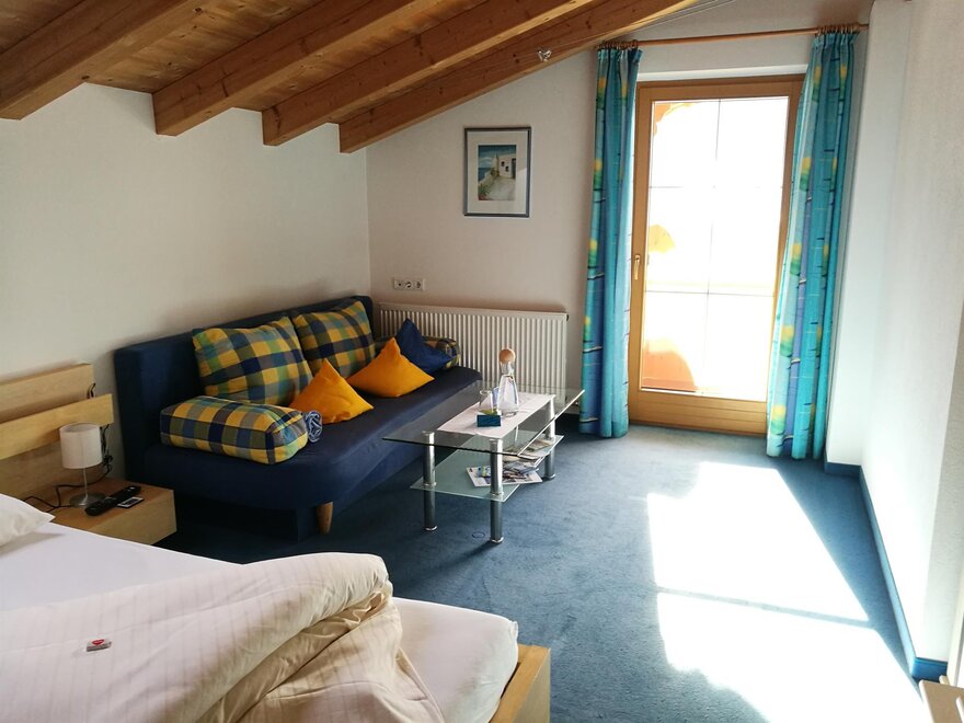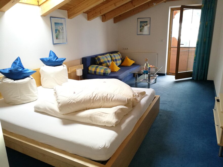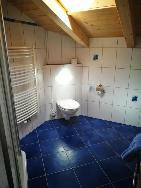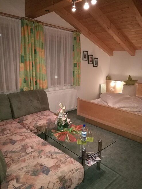 This dreamlike room (approx. 30 m²) with a comfortable couch corner and satellite TV is located on the ground floor, with its own bathroom (approx. 5 m²) with shower, WC and washbasin and a homely, cuddly roof frame and balcony, which is south facing and in a totally quiet location!