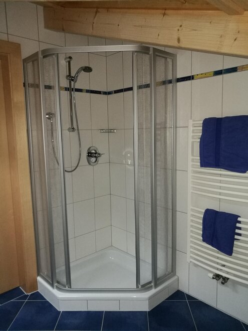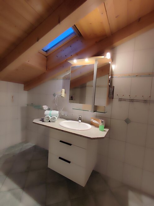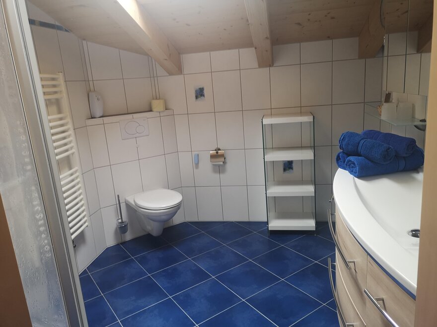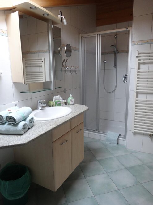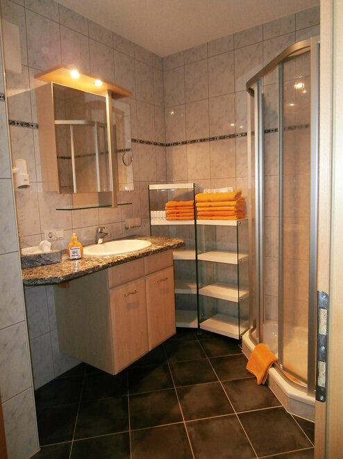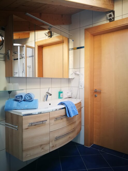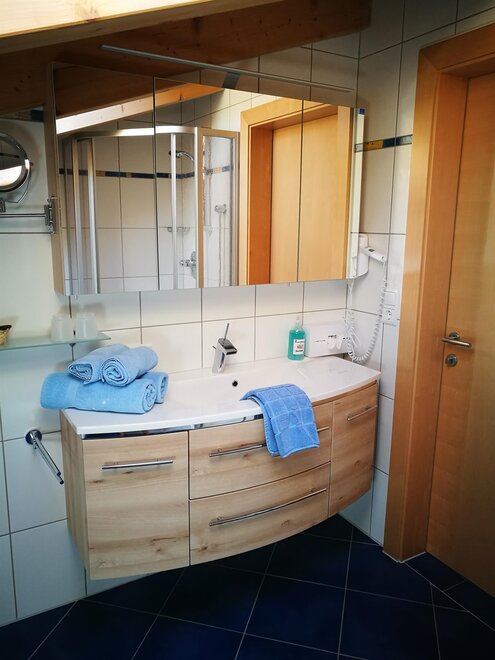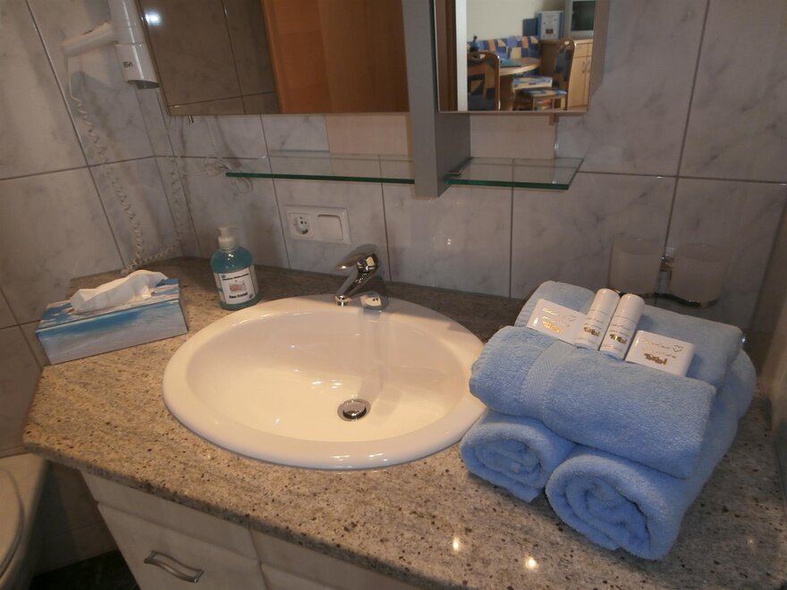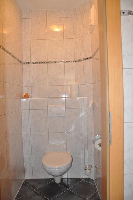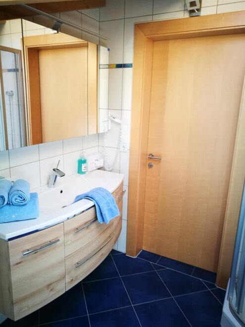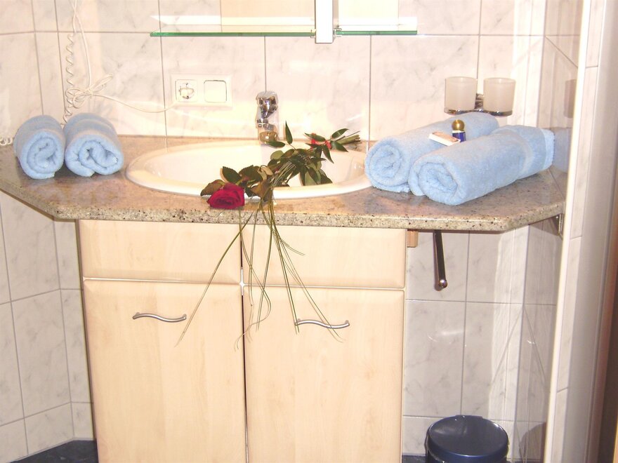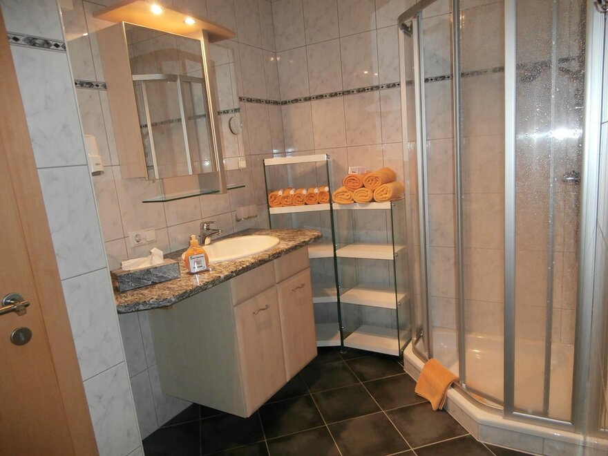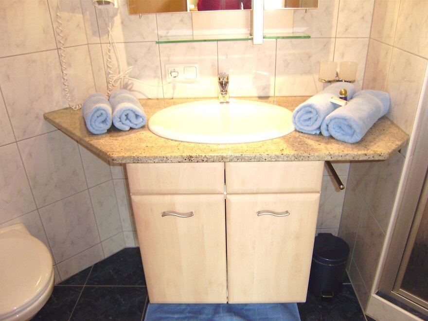 Double room has its own bathroom (approx. 5 m²) with shower, granite washbasin and WC.