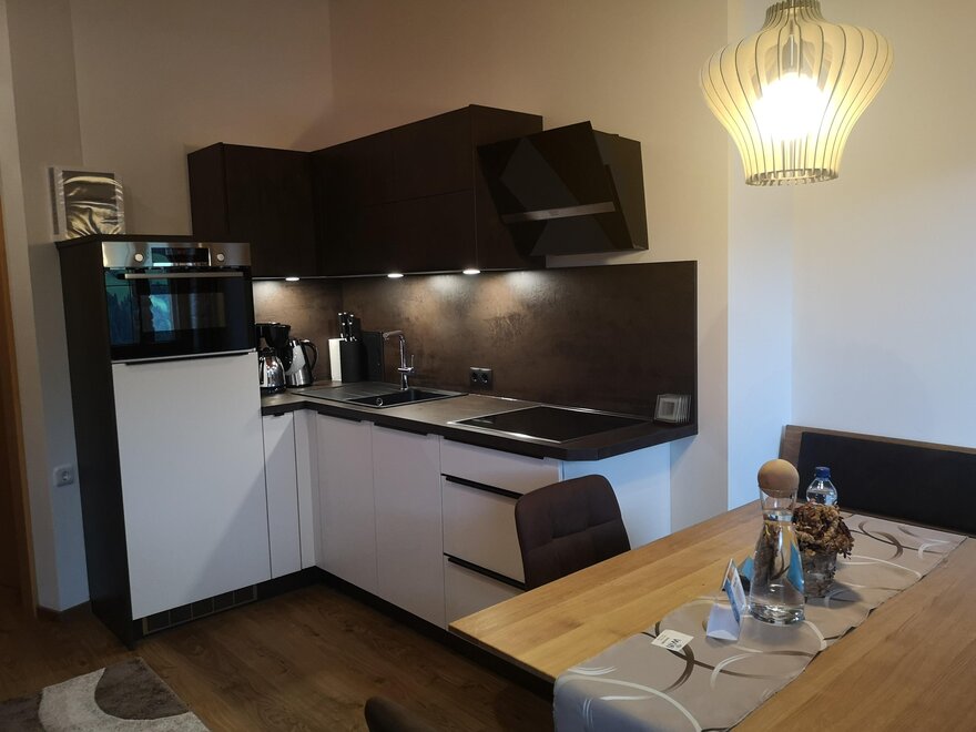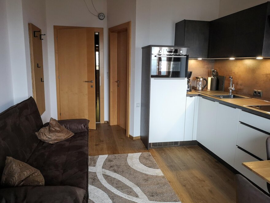 1 double room (approx. 18 m²), 1 triple room (approx. 14 m²), kitchen-living room with sofa bed (approx. 28 m²), bathroom (with shower and granite washbasin) and separate WC!