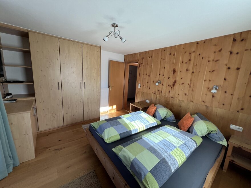The two bedrooms in the vacation apartment are equipped with natural wooden floors, beds, and furniture made of Swiss pine wood.