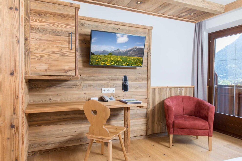 Comfortable double bed and sofa bed, bathroom with shower, WC, hairdryer, Desk, Great smart TV, fast W-Lan, Room safe, furnished balcony with mountain view to the Rofan Mountains or to the Zillertal