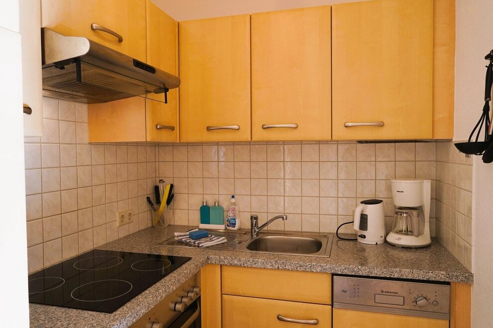 - kitchen-living room with dining table, sofa (bed), satellite TV, complete kitchenware, fridge, dishwasher, electric stove with oven, coffee maker & kettle, microwave oven