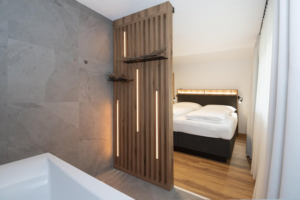 Experience our new Double Deluxe Apartment, tastefully furnished and perfect for a relaxing stay in the mountains. The spacious apartment features two separate bedrooms, two modern bathrooms, and a fully equipped living kitchen that invites you to linger.