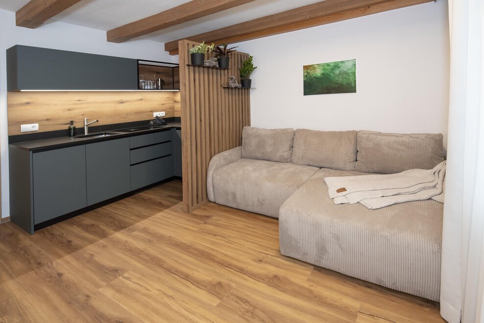 A special highlight awaits you in the bedroom: a whirlpool that invites you to relax and unwind. The entire apartment is furnished with high-quality natural furniture, with a strong emphasis on sustainable materials.