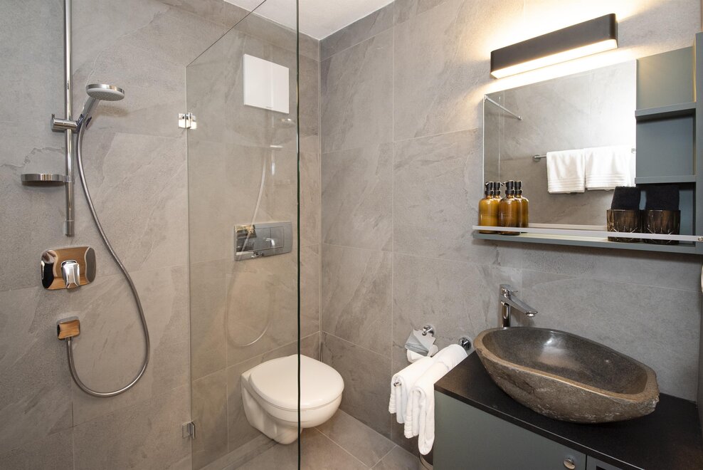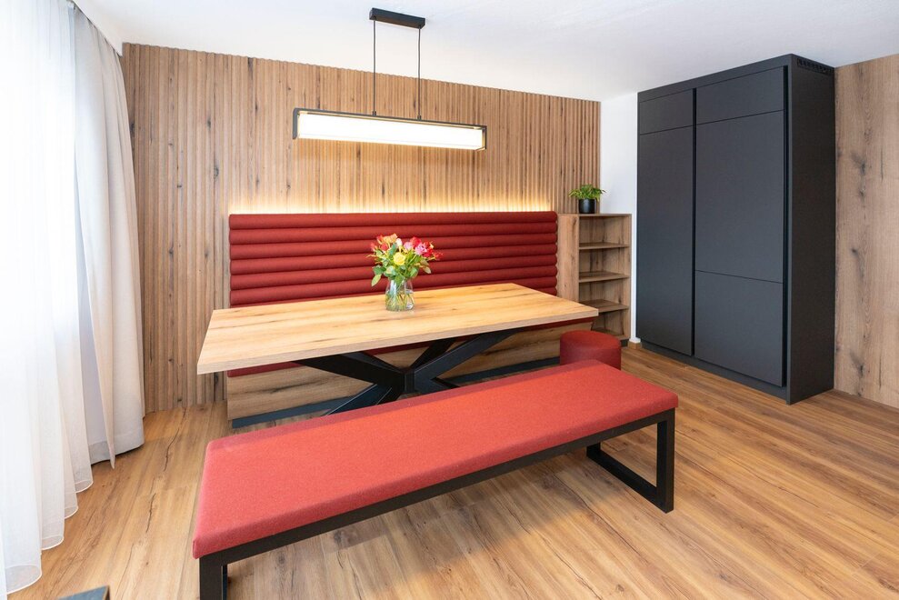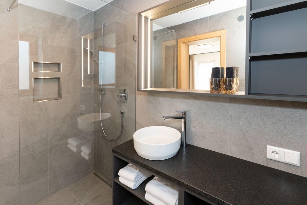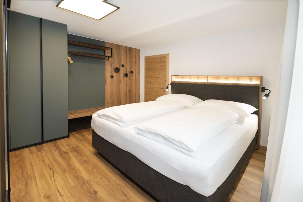 Experience our new Double Deluxe Apartment, tastefully furnished and perfect for a relaxing stay in the mountains. The spacious apartment features two separate bedrooms, two modern bathrooms, and a fully equipped living kitchen that invites you to linger.