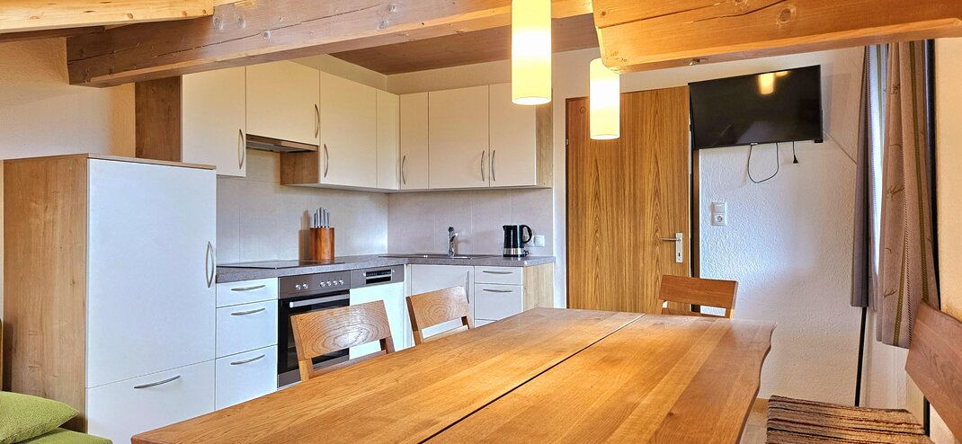 Kitchen and dining area in one room.Magnificent view of the lake, the center and the surrounding mountains!