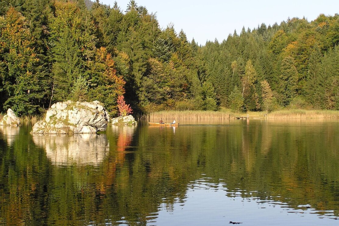 From the car park at the panorama board uphill in about 30 minutes to Berglsteinersee. This lake lies nestled between forests in a dreamlike natural setting. Then continue either left or right (stroller accessible) to the east end of the lake, a bit uphill again to the car park and further uphill on the asphalt road to the highest point "Salberg". From here first follow the road downhill to the next junction - turn right here "signposted Moosen", past the farmhouse and continue downhill over a beautiful forest and meadow path to Moosen. Cross the state road and at the next opportunity turn right again towards Reintalersee, shortly before the lake turn right uphill to the starting point.