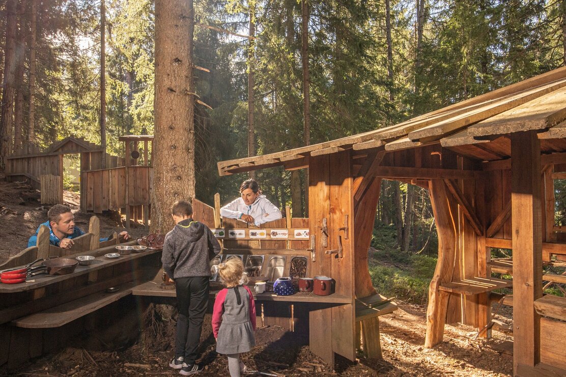 It's best to start directly with the circular hike. This leads past Nisslhof on the left and after about 10 minutes you reach a junction. Turn right into the forest here and after a few meters you are right in the middle of the magic village. To the right of the forest path are the enchanting play stations among the trees. The kids can really let off steam here and let their imagination run free. You will find a magic kitchen, the magic council, the forest tavern, the farm, the workshop, and the sought-after fire station. There are also plenty of rest benches with tables.