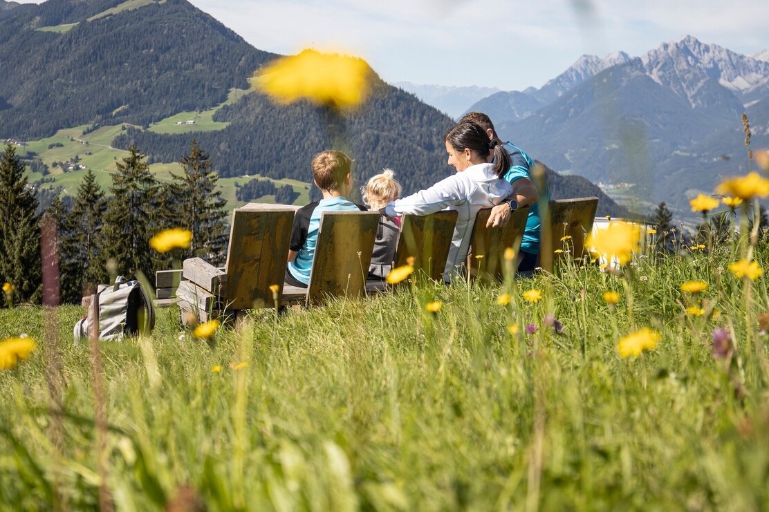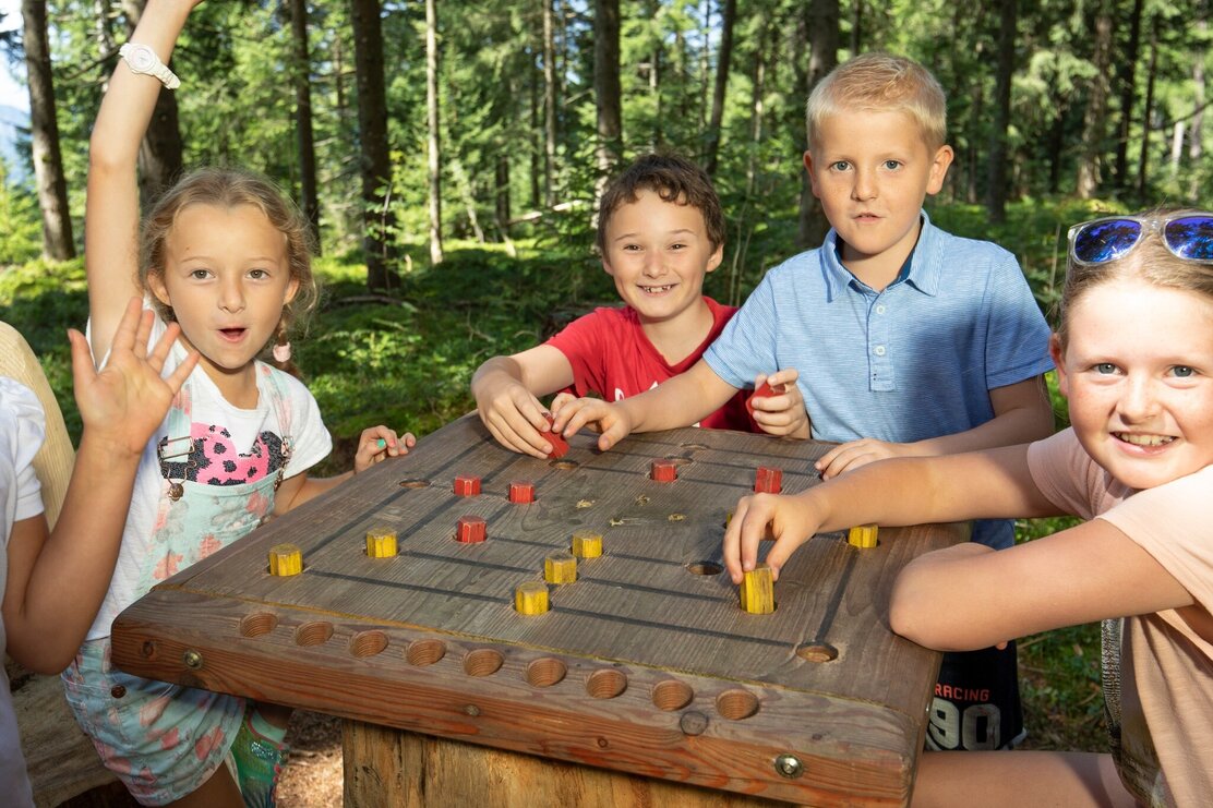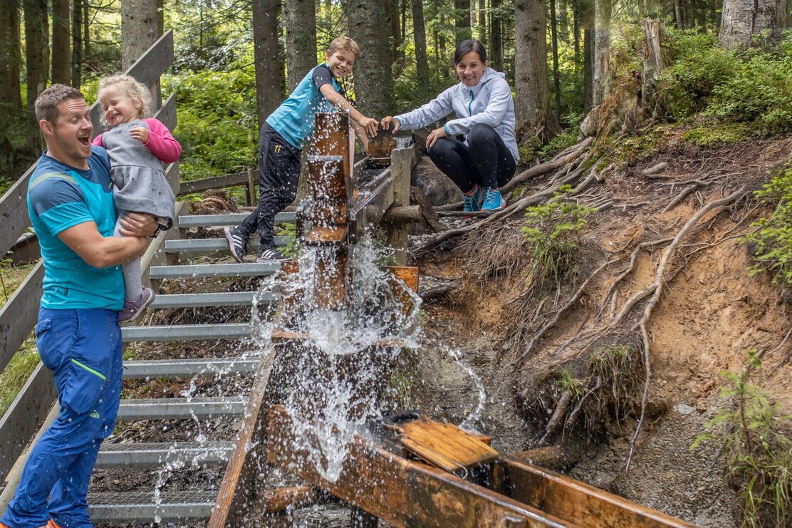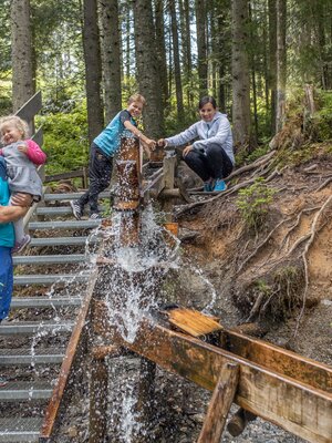 If the children can tear themselves away, follow the path further and then turn right into the forest path. Finally, follow the signs for about 10 minutes to the witch's house, the viewing platform (TIP - wonderful view of the Alpbachtal and Inn valley), and the fun water play.